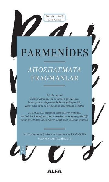 MÖ 6. yüzyılın sonlarında İtalya'nın güneyinde Foçalı göçmenler tarafından kurulan Elea kentinde dünyaya gelir Parmenides. MÖ 5. yüzyılın ortalarında yine aynı kentte hayata gözlerini yumduğunda ise, ardında felsefe tarihinin seyrini tümden değiştirecek bir eser bırakır. Elinizdeki kitapta çevirisi sunulan bu eser geleneksel olarak Doğa Üzerine başlığıyla anılsa da, Parmenides aslında diğer Sokrates-öncesi filozoflardan farklı bir çizgide ilerler, varlık sorununu felsefenin gündemine, hatta felsefi tartışmaların başköşesine yerleştirir. Felsefe tarihinde yarattığı kırılma, başta Zenon ve Empedokles olmak üzere pek çok filozofun görüşlerini derinden etkiler, hatta Platon ve Aristoteles'in varlık anlayışlarında yankı bulur. Günümüzde halen tartışmaların odağında yer alan bu eseriyle Parmenides, varlık felsefesinin en temel metnini insanlık tarihine armağan eder.